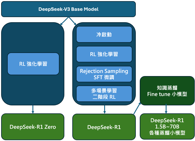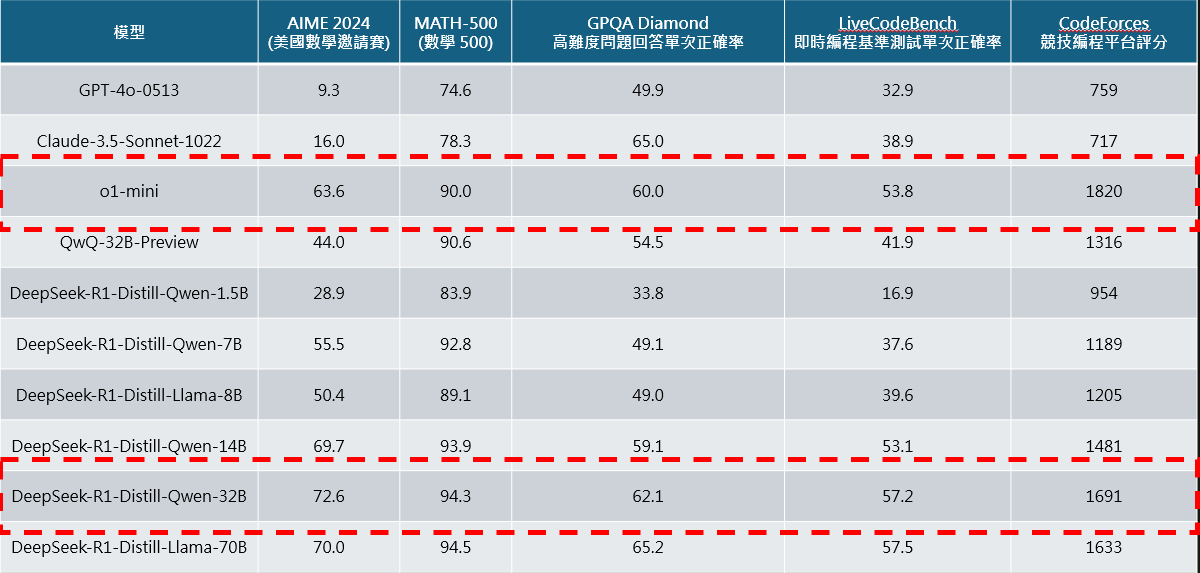 圖中提到 DeepSeek-R1-Zero 模型展現強大的數學、程式能力,然而其問題在 DeepSeek-R1-Zero 的可讀性、語言表達能力等相較 o1 等模型仍然較差,因此 DeepSeek 加入冷啟動 (Cold Start)、也就是先準備一堆思考鍊 Chain-of Thought,CoT 範本讓他學習,之後同樣通過 RL 學習強化,之後 Rejection Sampling 拒絕品質較低的回覆以及 SFT 的微調,成功開發出 DeepSeek-R1 模型,並且重點之處在於,DeepSeek 通過蒸餾模型,微調出較小但同樣具備推理能力的模型,這些模型的參數從 15 億到 700 億不等,其中最小的 DeepSeek-R1-Distill-Qwen-1.5B 甚至在 iphone 16 即可運行,而中等的 DeepSeek-R1-Distill-Qwen-32B 模型能力則媲美 o1-mini 模型,顯示相較於投入大量成本使用 RL 訓練 AI 模型,中小企業、甚至家戶僅需透過蒸餾模型技術,即可達到接近於先進 AI 模型的程度,大幅降低了踏入 AI 應用的門檻。