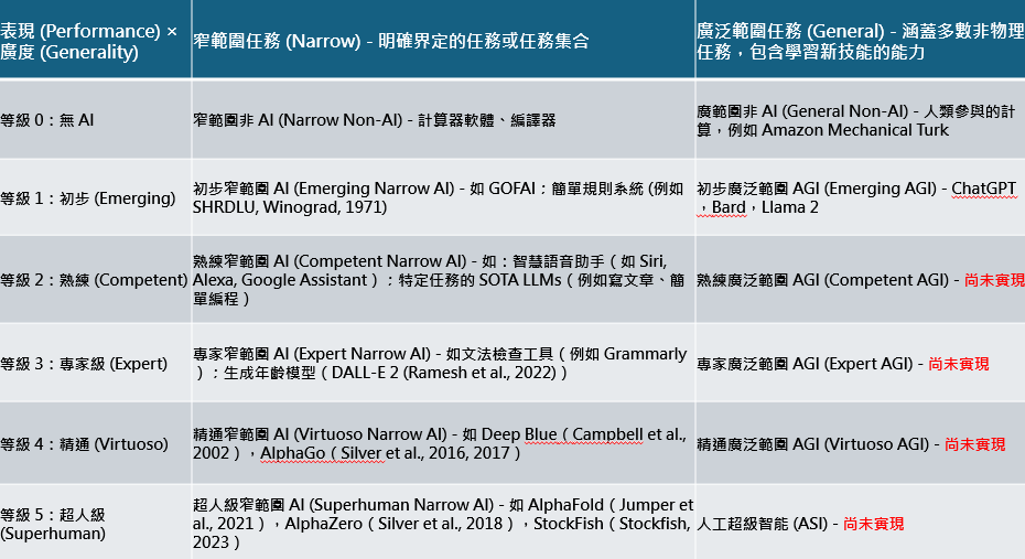 長線來看,大型雲端業者仍有投入高額資本支出必要:DeepSeek 的 R1-zero 及 R1 模型是通過 DeepSeek 過去發布的 V3 Base model 通過 RL 強化訓練得出,OpenAI 的 o1 model 也類似,是基於 GPT-4 Base model 訓練後得出,而未來也必須要發展至更高階 Base model 模型 ( 如 GPT 5 ),才能再透過訓練流程得出性能更佳的 AI model,而每一代的 Base model 的發展就必須運用到相較上一代更高的算力消耗,因此亦回應第一及第二點,對於大型 CSP 業者立場而言,他們與中小企業距離相近,然而身為龍頭公司,擁有必須是最先進 AI 模型的壓力 ( 放棄投資將被逐出長期領賽道 ) ,甚至在 Google 定義上的「通用人工智慧」(artificial general intelligence,AGI) ,人類目前僅在等級 1:初步 (Emerging),離真正實現最高階人工智慧還有很大段的距離,也可看出 Google 加大資本支出的立場,但短期科技公司可能會面臨股東壓力,且市場焦點將逐漸從投資 AI 硬體,轉向如何推出 AI 產品 ( 應用端上的實現 )。