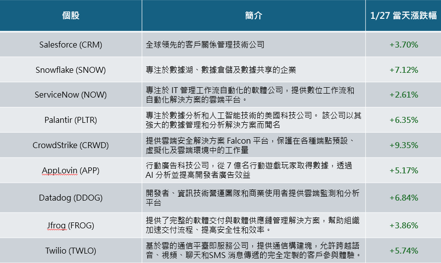 DeepSeek 事件將加速 AI agent 進程,未來開源環境將減低各公司間資訊落差,增快 AI 開發速度投入於應用端,如客戶關係管理如 Salesforce (CRM)、雲端資安產業 CrowdStrike (CRWD) 等公司長期將受惠於 DeepSeek 帶來的影響,未來將能提供更具成本效益的解決方案。提升市場競爭力,因此在 DeepSeek 公布後 AI 軟體相關概念股當周股價不跌反漲,未來看好 AI agent 在終端應用持續增加, 甚至是利用 AI 軟體的新創公司的崛起。