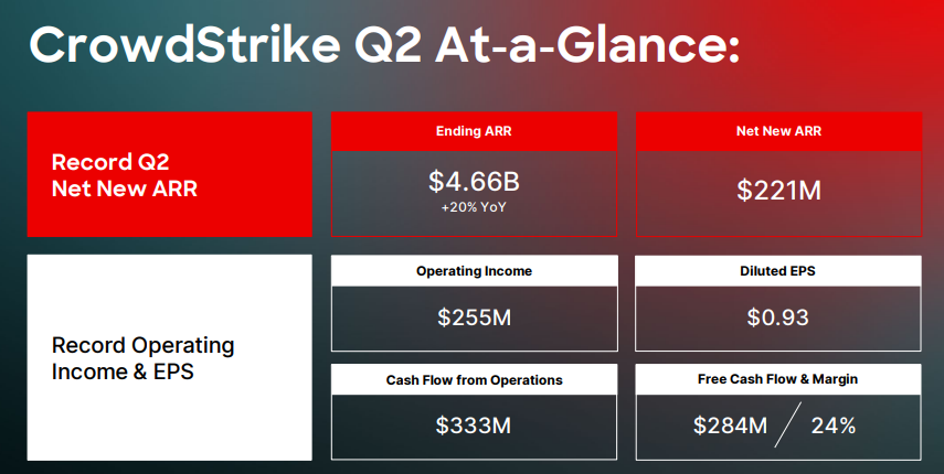 關注 CrowdStrike 的理由,現在比一年前更充分。第一層故事,是它仍在以高雙位數的速度擴張一個極大的市場:Q2 會計年 2026(截至 2025/7/31)營收 11.7 億美元,年增 21%;本季新增加的 Net New ARR 2.21 億美元,把期末 ARR 推到 46.6 億美元,年增 20%。