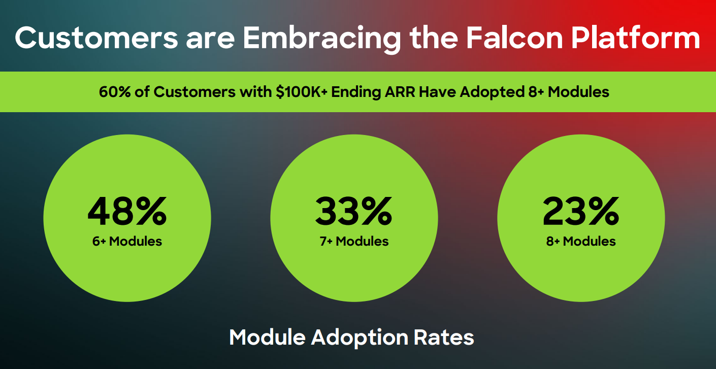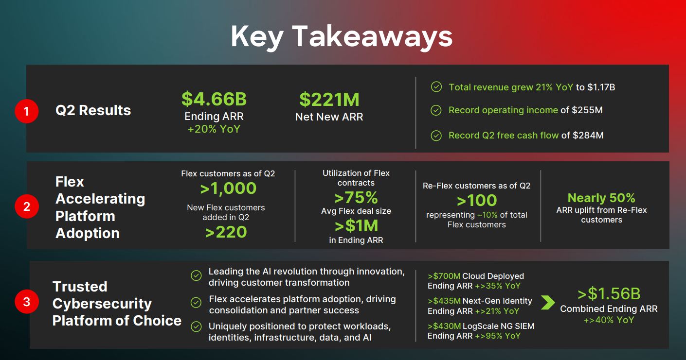 第二個亮點是 平台化的證據被量化。管理層披露,擁有 10 萬美元以上 ARR 的大客戶,有 六成 已經採用 ≥8 個模組;Flex 授權客戶累積逾 1000 家、本季新增 220+ 家,平均單案期末 ARR 超 100 萬美元,且合約利用率逾 75%。Flex 不是單純折扣,而是讓客戶以「整體安全能力」採購;當雲、身分、LogScale 等新模組在組織內逐步打開,平台的擴張率與 NRR 能被結構性拉高。