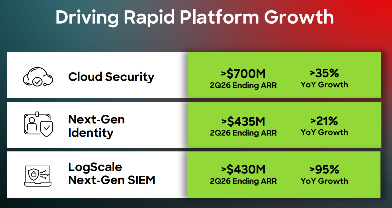 第二層故事,則是平台結構的質變正在被數據驗證:雲安全、次世代身分、以及 LogScale 次世代 SIEM 的合計期末 ARR 已超過 15.6 億美元、年增 40%+,其中 LogScale 年增 95%,雲安全超 35%,身分安全超 21%。單一「端點」的天花板,已被多產品平台的交叉銷售打破;「安全整合」與「替代點工具」的趨勢,使 CrowdStrike 的平台更像企業的安全作業系統。