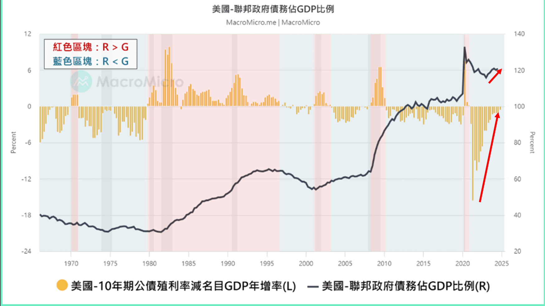 2024 年,美國預算赤字已超過 GDP 的 6.28%,主因為過去拜登政府透過大量撒錢的經濟寬鬆政策,其中淨利息上支出了 8,820 億美元,佔 GDP 比例達 3.02%,若財政赤字惡化下去,美國將迎向債務危機。