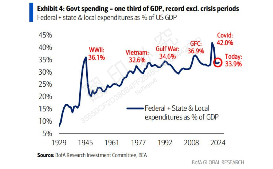 美國目前的國債總額已達到 36 兆美元,占國內生產毛額(GDP)的 121.85% ,並且仍在快速上升,主因為政府的支出遠超過稅收收入。2024 年,美國預算赤字已超過 GDP 的 6.28%,探究其原因,在過去拜登政府透過大量撒錢的經濟寬鬆政策,讓美國經濟於 2024 年進入非理性繁榮階段,S&P 500 於過去連兩年上漲超過 20%。