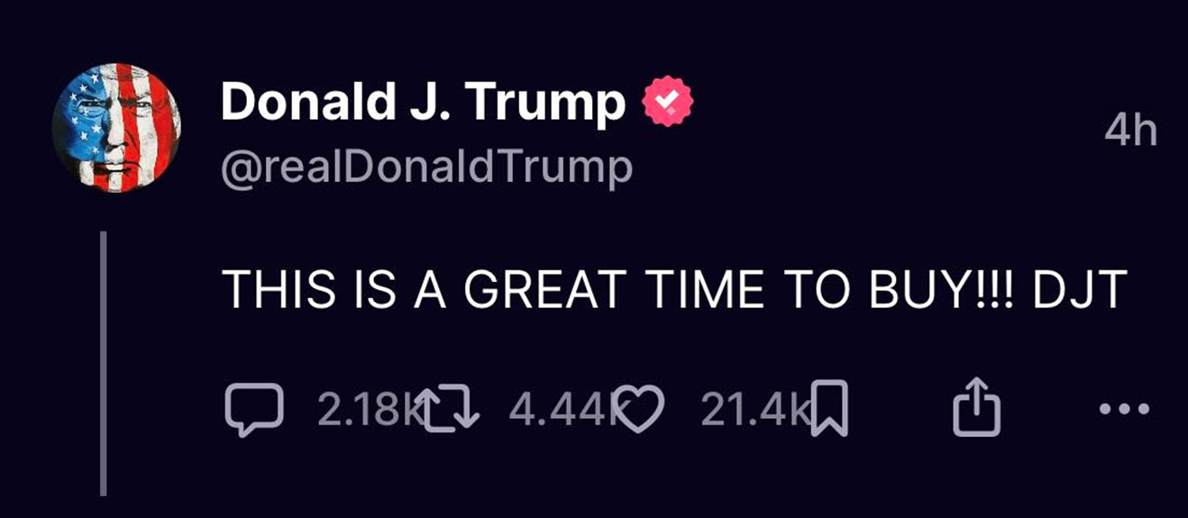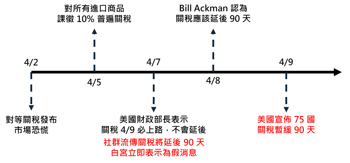 4/9 川普發文表示現在是個非常值得投資市場的時間點,在推文發布三小時後,川普宣布除中國外 75 國關稅暫緩 90 天,並且立即生效,股市大漲。