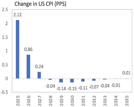 相對的,宏觀背景上也有許多不同之處,尼克森衝擊後美國經歷了十年的停滯性通膨打開了自由貿易,全球化的趨勢,然而如今川普搬出的改革方向,世界將走回了逆全球化、美國重新移回製造業、貿易保護主義。以保護主義建立起的關稅壁壘將導致了停滯性通膨再起,供應鏈移回美國造成重複投資,產能過剩,長期結構化的通膨局面將難以完全回到 2012~2019 的低利率時期,而據估算,依目前 (4/11) 的關稅政策預計將為美國今年帶來超過 2.12% 的 CPI 增幅,相對的 GDP 則會下降約 0.28%。