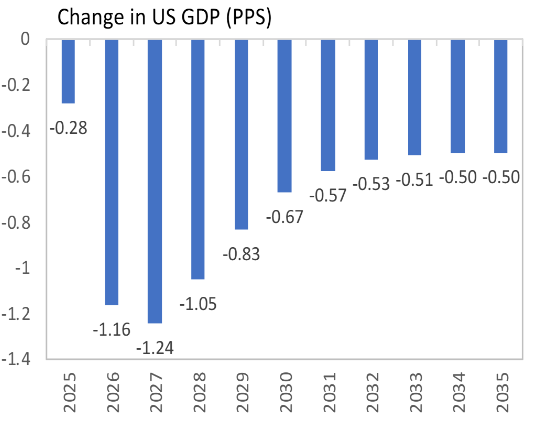 此次的關稅背景與 1971 年的「尼克森衝擊」類似,在當時造成經濟停滯性通膨,在此次逆全球化、貿易壁壘的情況下,預計目前 (4/11) 關稅政策預計將為美國今年帶來超過 2.12% 的 CPI 增幅,相對的 GDP 則會下降約 0.28%,各國產業的 GDP 及出口亦將受到程度不一的影響。