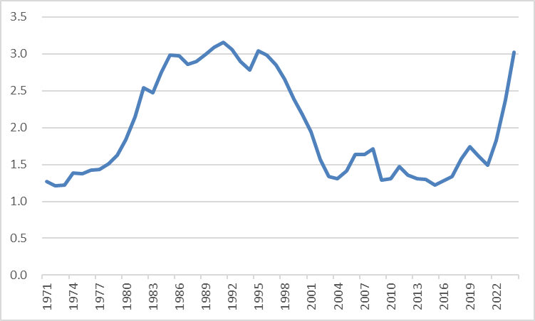 3. 債務赤字佔 GDP 從 10 年前的 2.42% 惡化至 6.28%