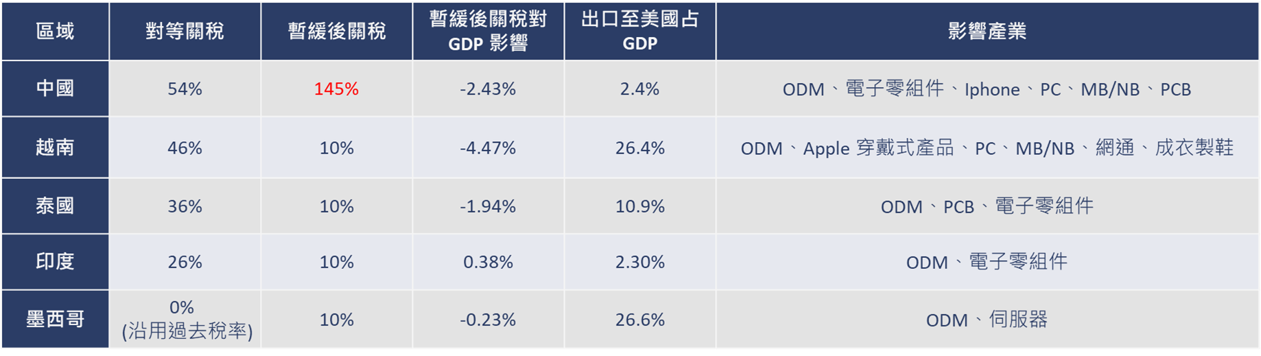 此次關稅蘋概股及板卡相關產業衝擊最大,其次為 PC/NB、網通及成衣製鞋產業,並以伺服器及半導體業影響最小。