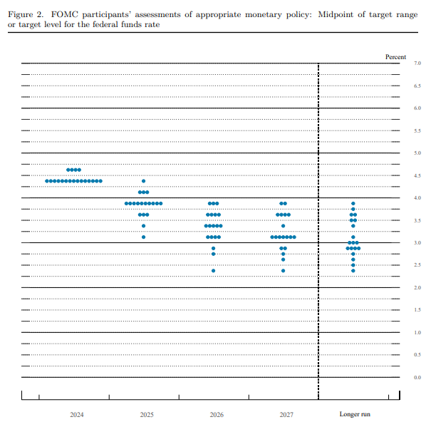 - 核心PCE通膨指標:2024年預估從 2.6% 上修至 2.8%;2025年和2026年分別上修至 2.5% 和 2.2%。