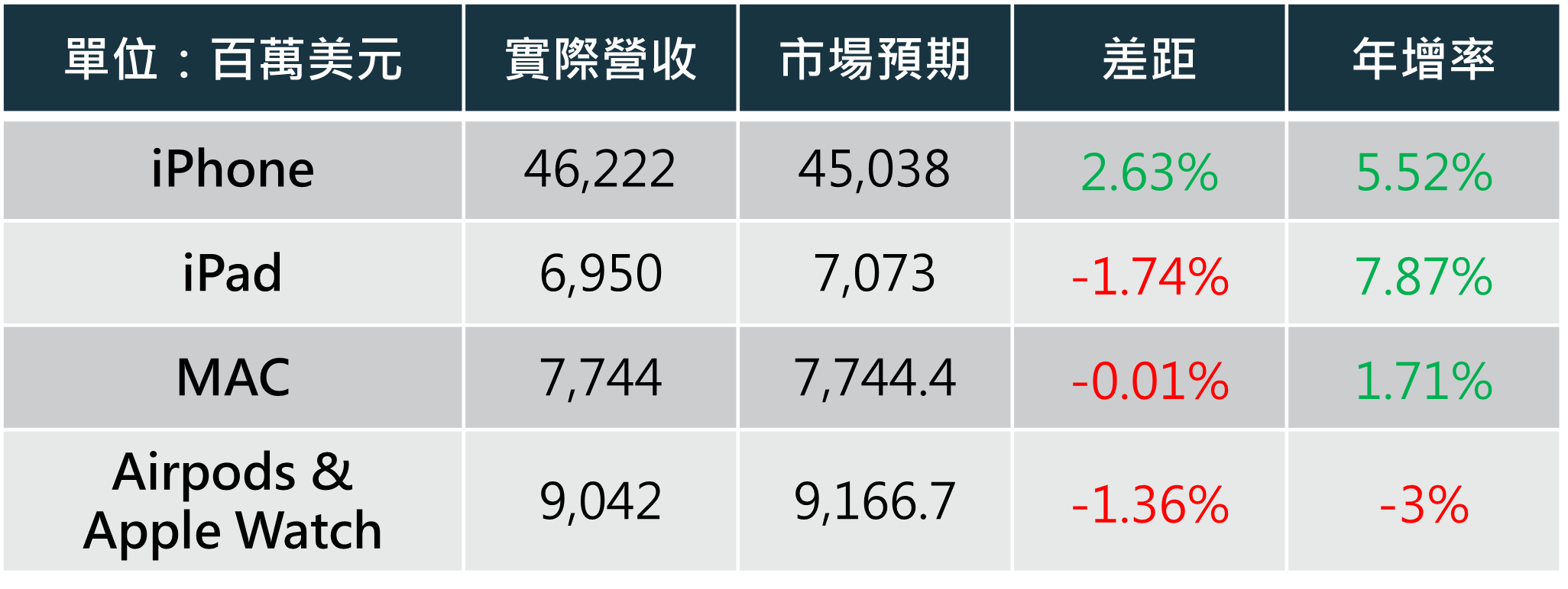 產品收入: 五大產品除了 iPHONE 以外,表現皆低於市場預期