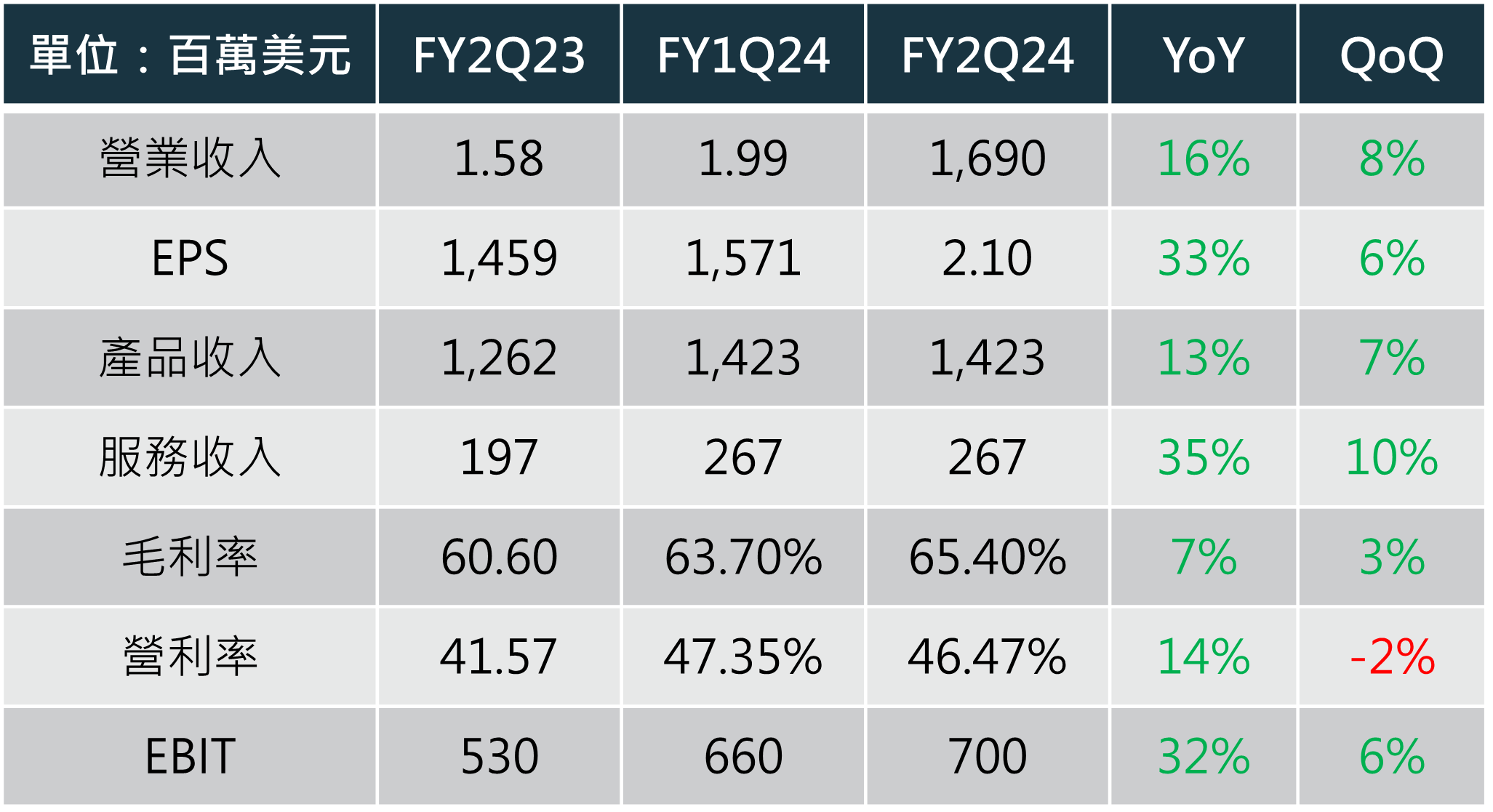 Arista 於 7/30 公布 2Q24 財報,營收及毛利率表現亮眼:總營收為 16.90 億美元,年成長 15.9%,毛利率從去年同期的 60.6% 提升至 65.4%,帶動 EPS 年成長 33% 至 2.10 美元。