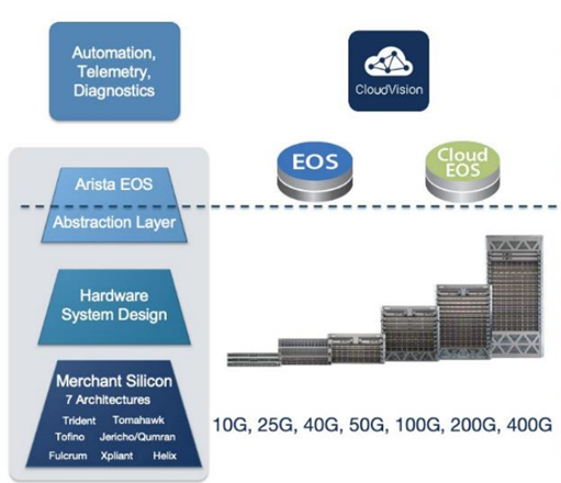 - 選用商用晶片:Arista 的交換器長期使用博通的交換晶片;商用晶片的優勢為更新速度快、成本低,相較之下,自行研發交換晶片的 Cisco 在最新交換晶片上已落後博通兩年。另一方面,直接採用商用晶片也能節省研發費用,使 Arista 專注於投資於較具優勢的軟體部分。