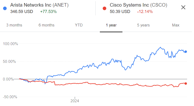 目前 Cisco 仍是交換器市場的老大,光第二季營收就是 Arista 的 8 倍以上。但 Arista 的股價成長性卻遠遠勝過 Cisco。