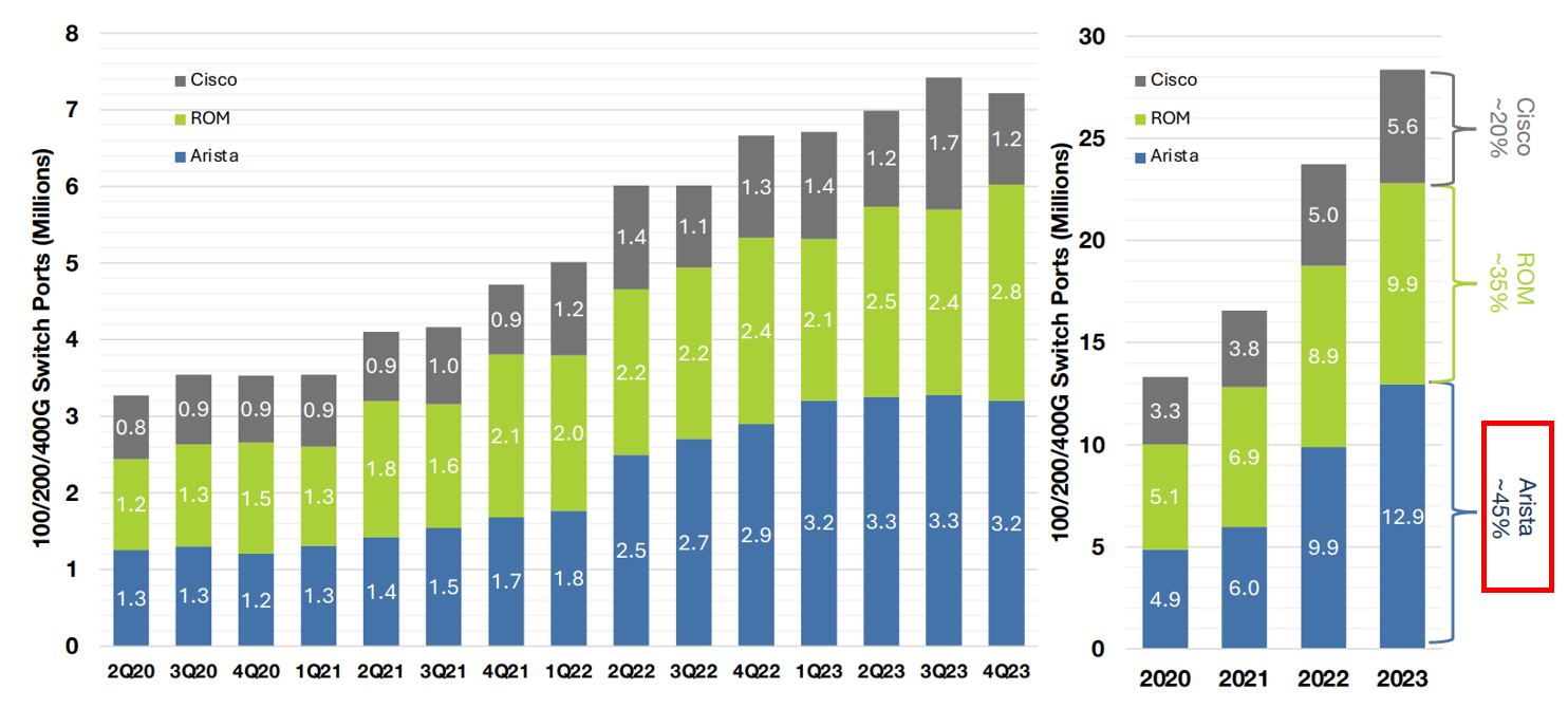 而隨著 AI 應用推動雲端運算需求增加,資料中心規模持續成長,對傳輸速度要求也更高。預計 2027 年 100G 以上接口的市場份額將達 83%。而 2023 年 Arista 在高速資料中心交換器(100/200/400G)出貨份額約佔 45%,相較之下 Cisco 只有近 20%。因此 Arista 有望憑自身在高速交換器市場的領先優勢,擴大資料中心營收