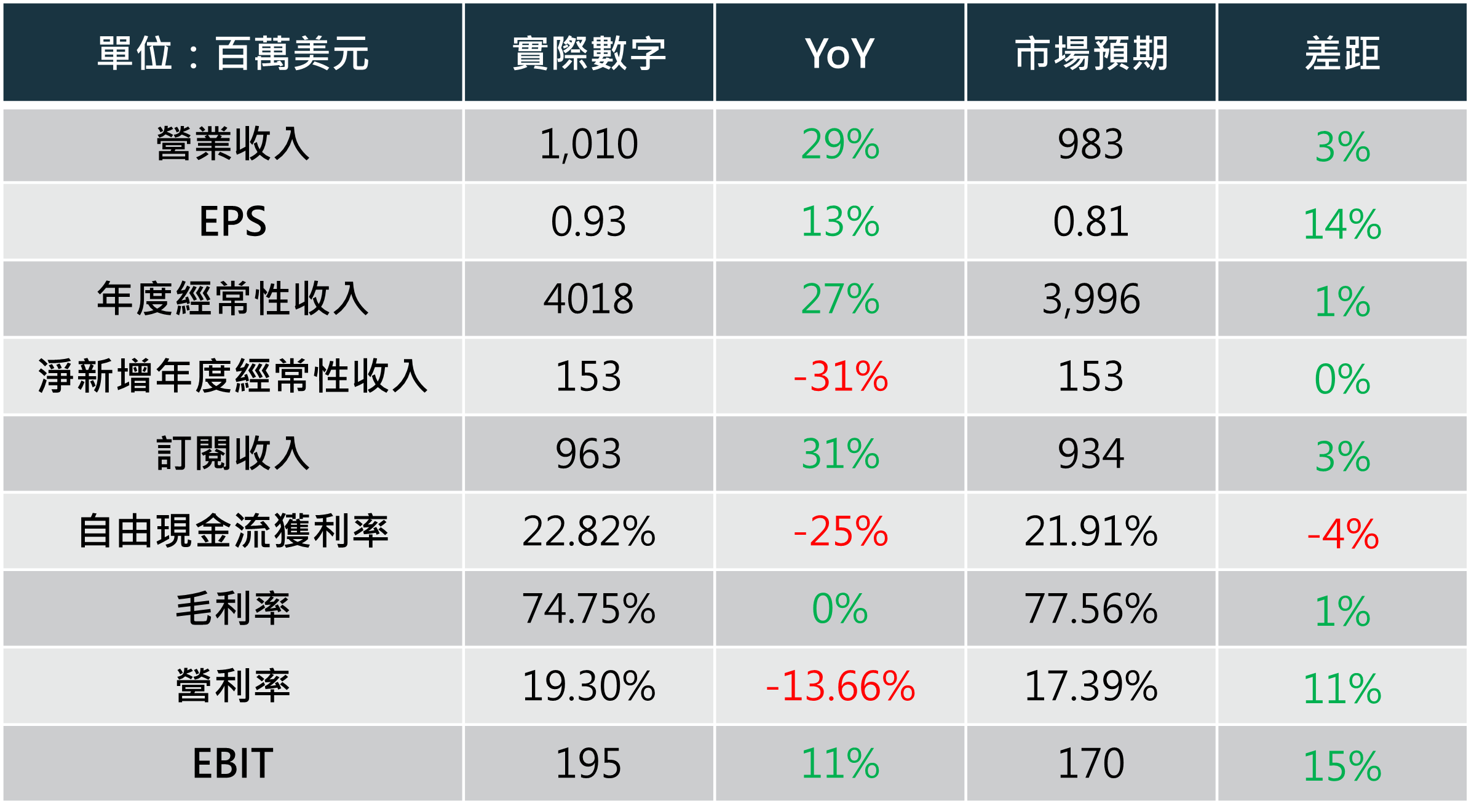 Falcon Flex 是一種彈性訂閱模式,與一般按需選購模組的訂閱方式不同,客戶可以根據使用量付費,根據需求隨時啟用所需的模組,使用費用從合約餘額中扣款。此模式鼓勵客戶探索更多模組功能,顯著增加模組使用數。本季 Falcon Flex 新增交易超過 150 筆,平均每工作日完成兩筆交易,帶動相關帳戶的總交易價值達 13 億美元。由於 Falcon Flex 合約價值遠高於一般合約,預計將成為公司 ARR 增長的重要推手。 - 財務表現超預期