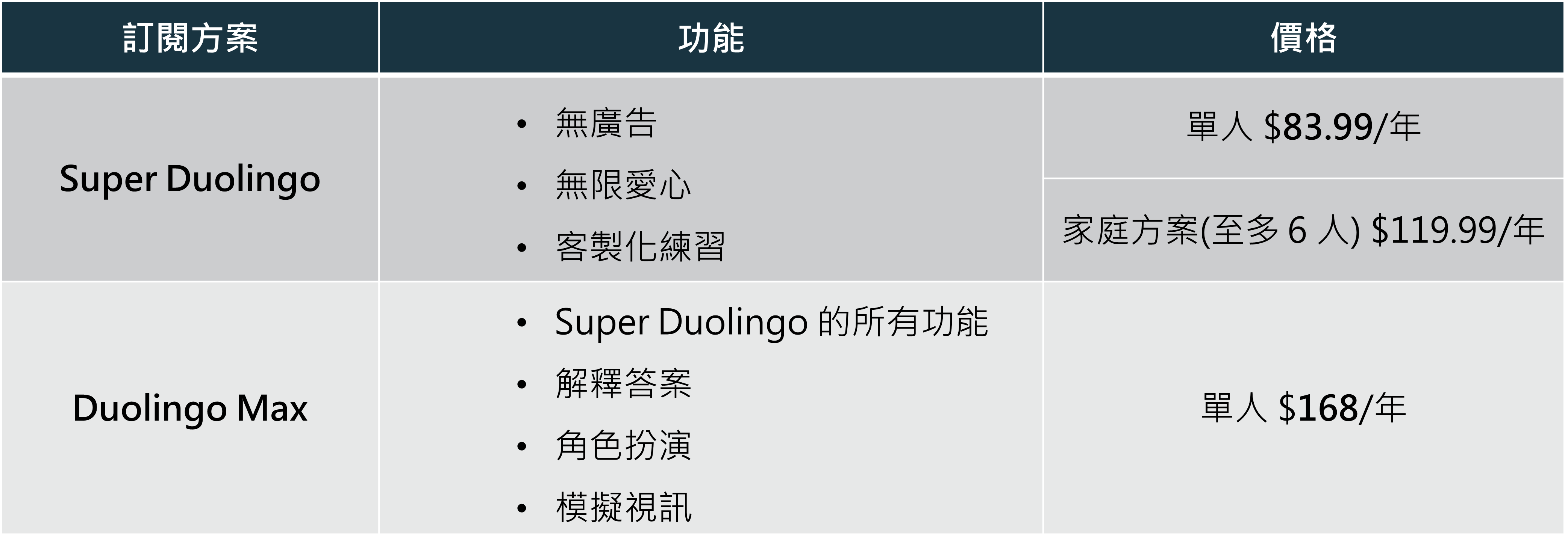 過去的訂閱模式唯有 Super Duolingo 一種,功能包括:無廣告、無限遊玩時間(題目答錯不會被扣生命值)、挑戰較難的練習關卡、客製化練習等。價格為 $83.99/年,家庭訂閱(6 人不限身分)則是 $119.99/年。