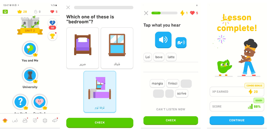而除了一般的聽說讀寫練習以外,Duolingo 與其他語言學習類程式最大的不同在於遊戲體驗,他的軟體介面設計仿照遊戲關卡,且在練習過程中有答錯會扣生命值的機制,一旦生命值歸零就需要等生命值回復,否則無法繼續課程。另外也注重答題時的回饋,再加上介面使用高識別度的配色、卡通式人物設計、配音等,達到如遊戲一般的體驗。