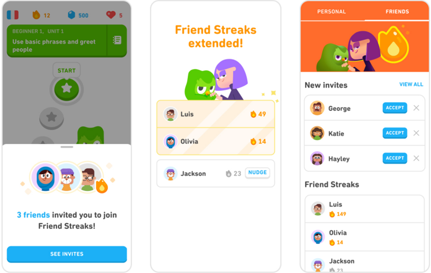 除了Duo的每日訊息提醒以外,Duolingo 也透過用戶之間的社群連結來提升 DAU。例如:Friend Streak 好友連勝,可以讓至多 5 位好友分享每日完成課程的紀錄,管理層認為擁有 1 個以上共享連續記錄的學習者可以讓完成每日課程的可能性提高 22%。另外還有主題排行榜,讓位於同一國家並學習相同語言的用戶進行積分排名。除了增加用戶之間的互動性,也提高用戶持續使用的意願。