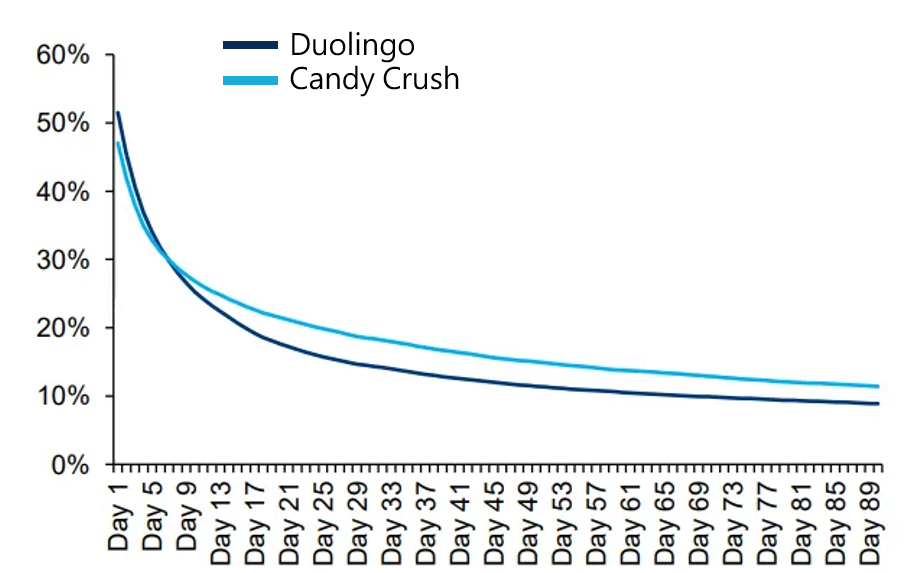 目前 Duolingo 的用戶留存率已接近休閒手機遊戲的水準,相較其他學習平台更有效留住用戶。
