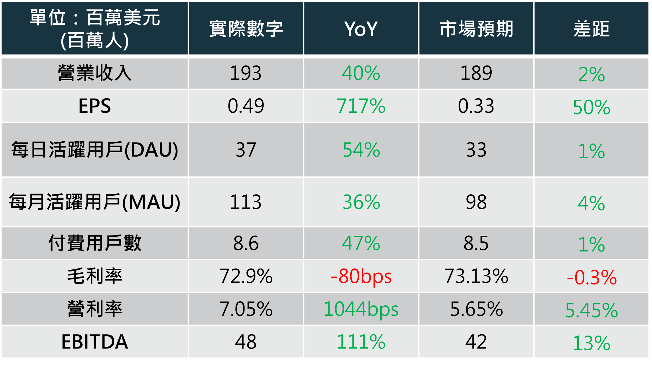 公司於 11/6 公布第三季財報,營收及訂閱數成長皆超越市場預期,調整後 EPS 達 0.49美元,高於市場預期的 0.33%。本季的每日活躍用戶(DAU)、每月活躍用戶(MAU)、付費訂閱用戶數都維持在高成長水準,分別為 54%、36%、47%,推動本季訂閱收入年成長 45%。毛利率也保持在 73% 的健康水準。