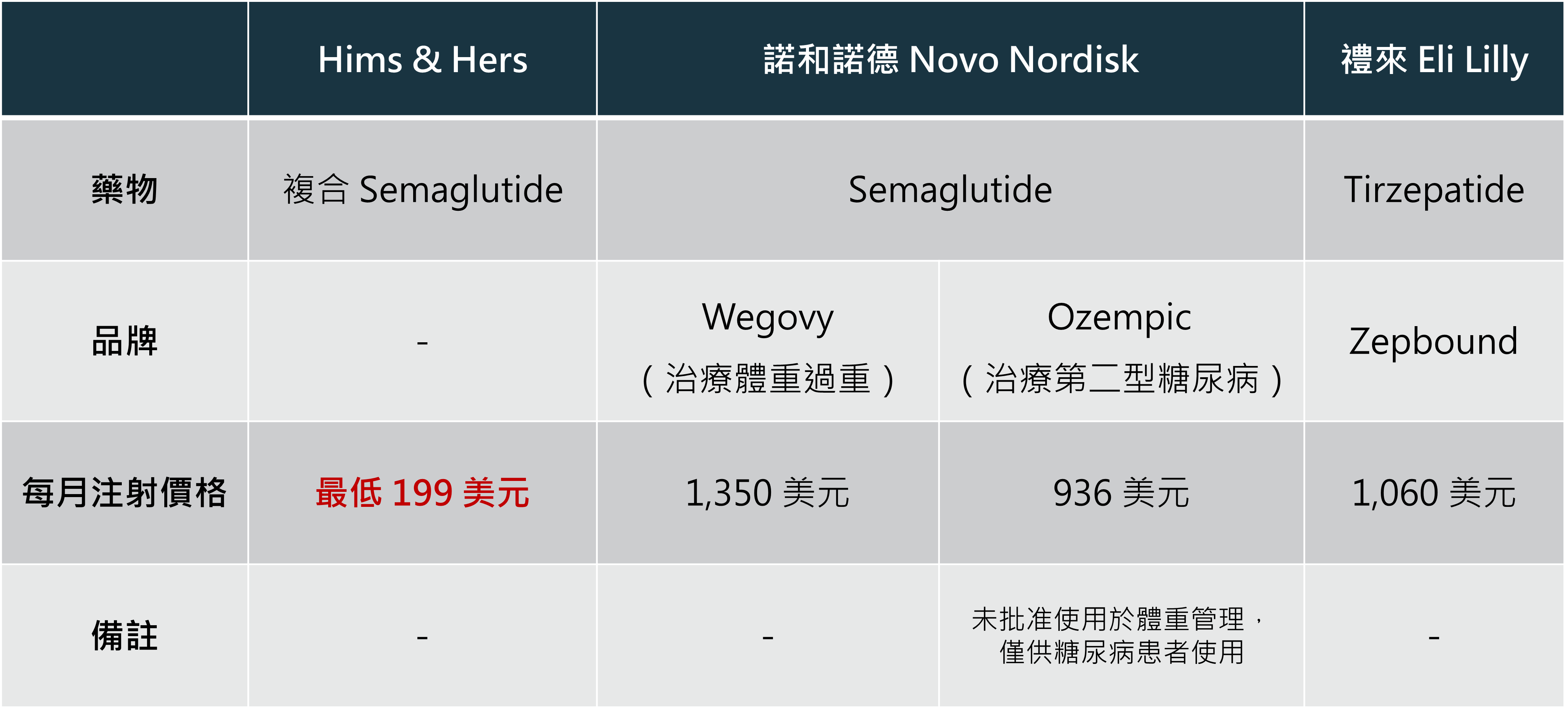 HIMS 抓住這個機會,推出了semaglutide 的複合藥物,其價格比諾和諾德的品牌藥物更為低廉(見下方整理表格),使消費者在短缺期間能夠以較低的成本獲得有效的治療,從而推動了HIMS 股價的成長。