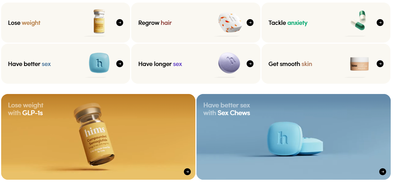 研究顯示,許多男性消費者寧願選擇搜尋網路資訊或購買非處方產品來解決問題,也不願去看醫生。HIMS 正是針對這一需求,提供了一條龍的遠端醫療服務平台,讓消費者能夠線上看診、隨時傳訊息詢問醫生,並定期將客製化藥品直接送到家。消費者只需每月支付選擇的訂閱方案費用就能享有以上服務,訂閱費用則根據所選藥物而有所不同,大部分病症(如:脫髮、性功能障礙、皮膚問題)每月價格低於 50 美元,或是也可選擇一次性購買非處方藥物。這降低了傳統醫療系統的繁瑣程序及高額費用。