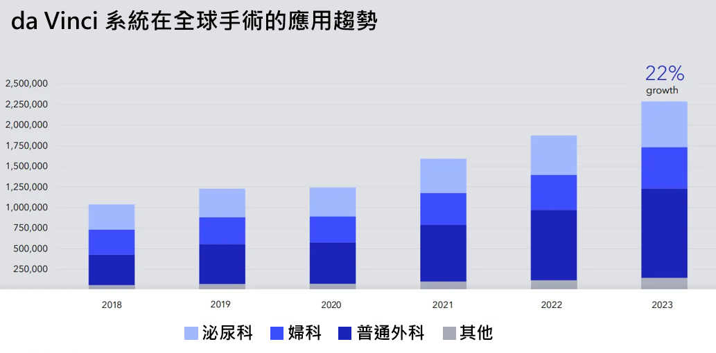 而從手術量來看,近幾年使用 da Vinci 系統的機器人手術量年成長大約都保持在 15- 20%,主要的成長推力為仍在發展中的普通外科手術,美國境內的普通外科手術在去年的成長率達到 25%,非美國市場的非泌尿科手術年成長更達到 35%。
