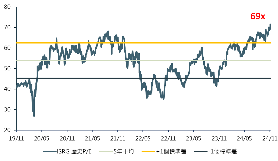目前公司的本益比約落在 69x,處於歷史高位,推測目前偏高的股價已經反映手術量的顯著成長以及新系統 da Vinci 5 強勁的發售表現,且市場對未來手術量成長也抱有較高預期。相較同業更高的溢價也已經反映 Intuitive 在產業中的領導地位。