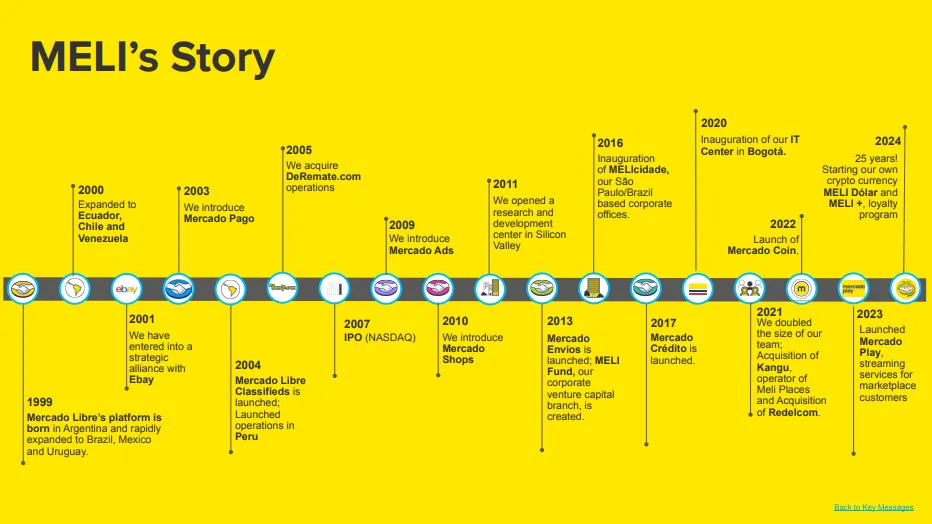 MercadoLibre, Inc.(MELI)西班牙語為自由市場於 1999 年在阿根廷成立,28 歲的 Marcos Galperin 正在美國史丹佛大學攻讀 MBA,當時拉丁美洲仍處於網路普及度很低的起步階段, Galperin 受到美國電子商務平台如 eBay 和 Amazon 的啟發,立志要打造一個拉美版的 eBay,並把握機會在課堂後向投資人 John Muse 簡報自己的構想,並取得了初步的創業資金。