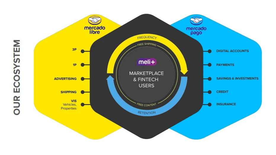 2. 金融科技引擎的驅動: MELI 不僅是電商更是金融科技巨擘,具備完整的「購物 + 支付 + 放款 + 投資」整合生態系。使其在廣闊的拉丁美洲金融服務市場中佔據有利地位,深化生態系統的用戶參與度和價值創造,並與電商業務相互強化,構成高效的平台飛輪。