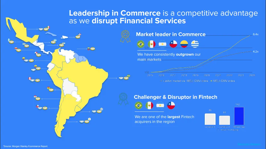 其中 Mercado Libre 的電子商務平台在 18 個國家設有據點,於商品交易總額(GMV)計算位居領先地位,而金融科技平台 Mercado Pago 則在 8 個國家設有據點,以每月活躍用戶(MAU)數量位居領先。