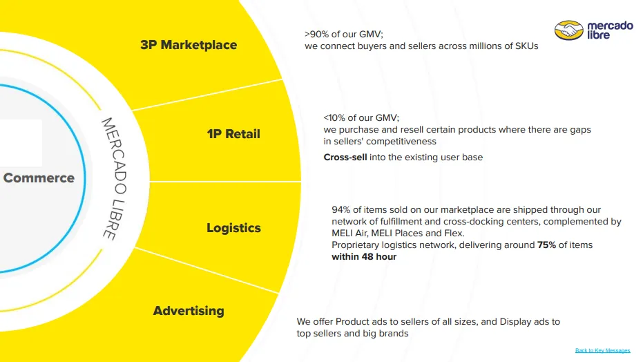 電子商務主要以第三方賣家(3P)佔 Marketplace 上交易 GMV 超過 9 成水準,並在特定產品類別採取自營銷售(1P)的形式,並透過完善的垂直整合策略於拉丁美洲建立強大的物流系統,於平台上提供如 Mercado Envios 物流解決方案,極光告業務來禁行交叉行銷以更好地控制完整用戶體驗。