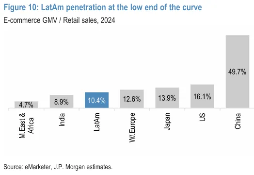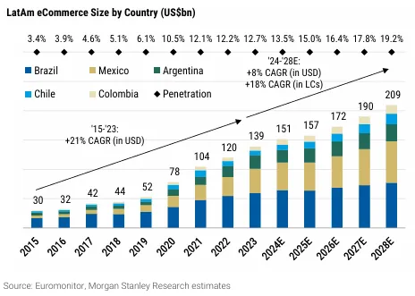 1. 電商與廣闊前景與 MELI 的市場主導地位:拉丁美洲電子商務市場的滲透率仍處於相對較低的水平,在此背景下,MercadoLibre 作為該區域最大電子商務平台的地位,於拉丁美洲三大市場巴西、墨西哥、阿根廷皆佔據頭部地位,並在巴西、墨西哥等地建立密集的倉儲與配送網絡,有效拉開與競爭對手 Shopee、Amazon 的差距,深度物流整合不僅提高用戶體驗,也形成難以複製的護城河。