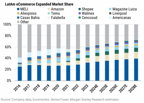拉丁美洲電子商務市場正迎來巨大的成長潛力,這也自然吸引了全球眾多競爭者的目光。儘管 MercadoLibre (MELI) 在巴西、墨西哥、阿根廷三大經濟體中仍保持領先地位,但來自 Shopee 在巴西的崛起、亞馬遜在巴西及墨西哥的持續深耕,以及 Temu 近期推出的跨境服務,都對 MELI 構成了顯著的競爭壓力。