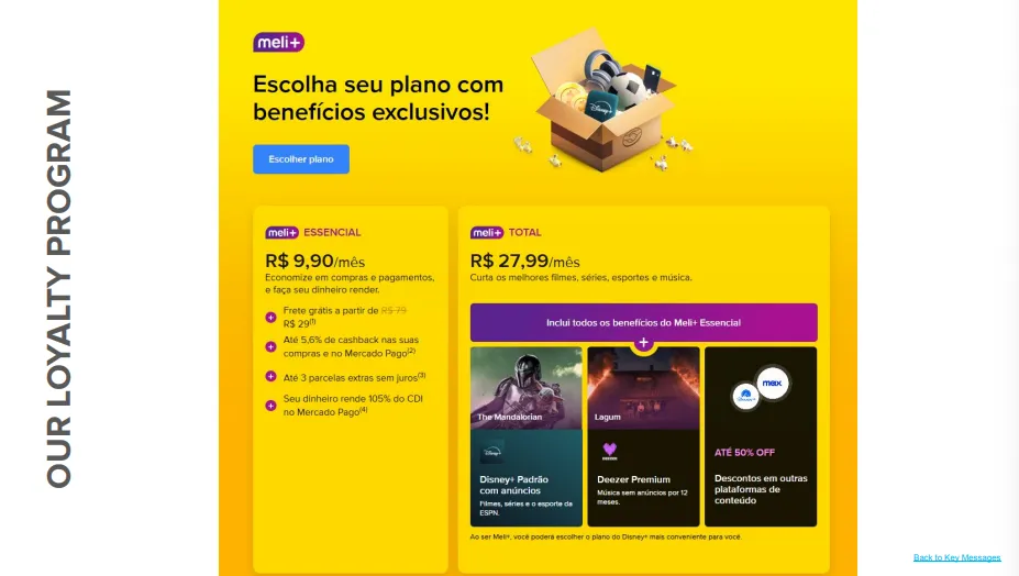 為了提供客戶更好的加值服務並有效提升黏著度及回購率,MELI 也推出如 Amazon Prime 會員的 MELI+ 會員計畫其模式也從分級制計畫(取決於在 MercadoLibre 內的購買金額)轉變為月費訂閱模式,並根據不同地區推出不同方案。
