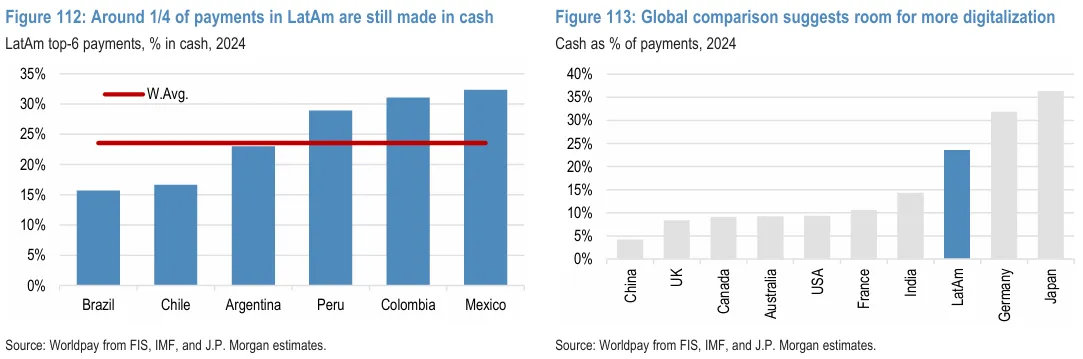根據 FIS 的 Worldpay 報告,2024 年拉丁美洲支付市場交易量達到 2.9 兆美元,其中以巴西佔 32% 最大,其次為墨西哥佔比 25% 及阿根廷佔比 10%。報告顯示拉丁美洲仍有 24% 的總交易量以現金結算,相比其他電商市場,中國現金結算僅 4 % 而美國僅為 9%,表明支付產業存在機會。MELI 在 2024 年的 TPV(總支付額)達到 1,970 億美元,佔拉丁美洲支付市場的 6.9%。