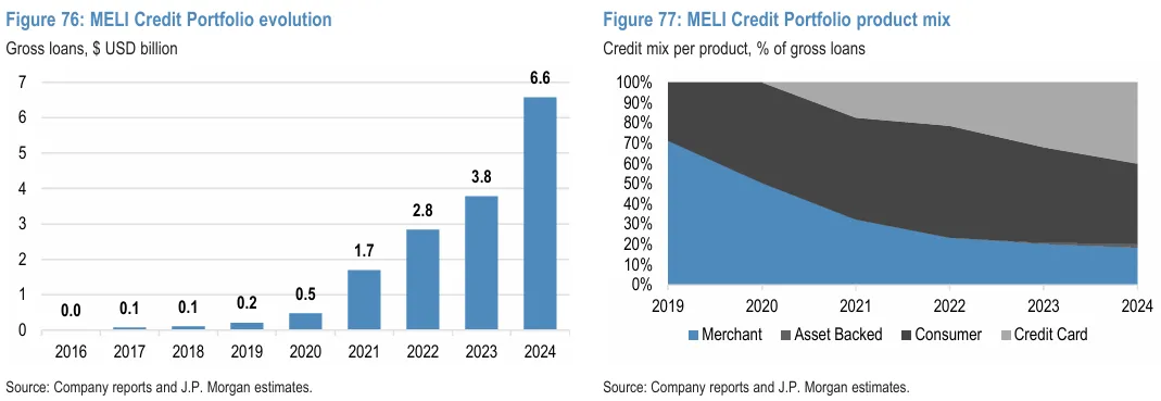 MELI 的信貸業務起初於 2016 年向平台賣家提供營運資金貸款,不久之後又向信用卡額度不足的買家提供先買後付(BUY NOW PAY LATER)信貸,隨著業務逐漸拓展,如今 MELI 信貸已成為一項獨立的銀行服務,截至 4Q24,其總貸款組合達到 66 億美元,分佈在巴西、墨西哥和阿根廷。