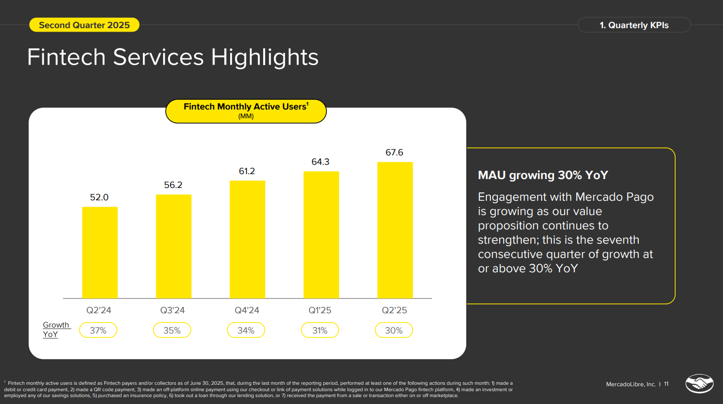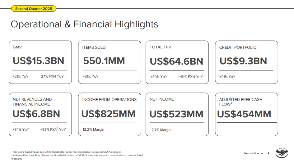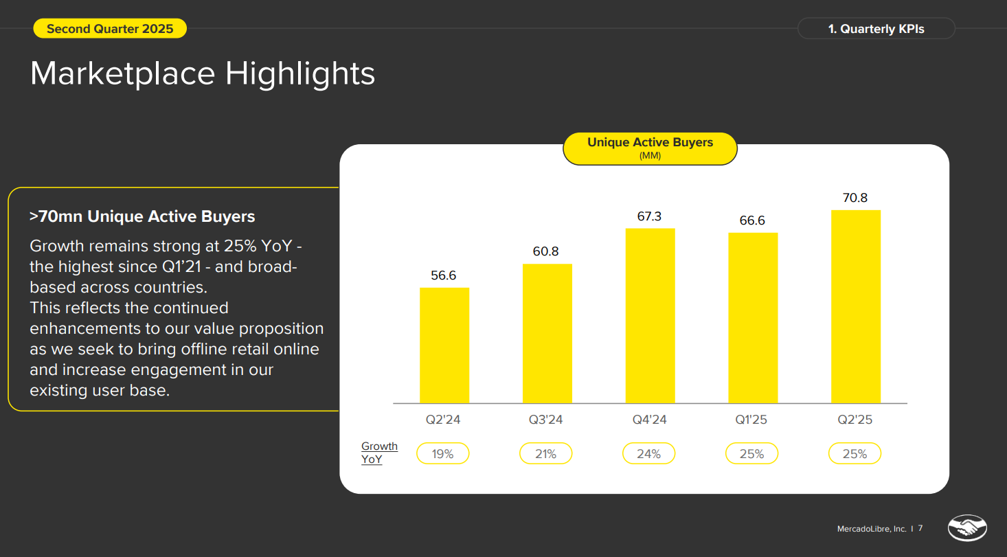 2Q25 MELI 的活躍買家數量同比增長 25%,交出與上季相同的成績單,這是自 2021 年第一季度(疫情期間)以來最快的增長速度,總人數正式超越 7000 萬人;這項快速增長歸因於公司在價值主張方面的大量投資,透過 MELI+ 推出 MELI Delivery Day,使賣家能夠以低於一般最低價值的免費送貨來履行訂單,來持續 MELI 持續吸引新用戶到其平台。