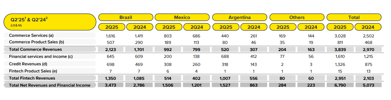 - 金融服務收入:透過支付解決方案和資產管理產品平台收取的交易佣金、信貸收入、提供分期付款的收入(無論是直接融資交易還是出售相應的金融資產)、 現金和投資所賺取的利息、銷售行動數位支付設備收入及 Mercado Pago 金融卡佣金和保險科技費用。