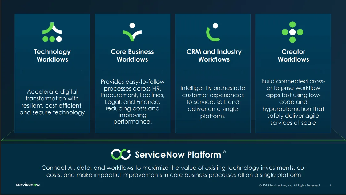 ServiceNow 透過模組化平台的架構來其功多樣化的模組供客戶組合實施擴充性部屬,涵蓋涵蓋 IT 工作流程(ITSM、ITOM)、業務工作流程(如 HR、客服)、開發者平台(App Engine)以及行業專屬解決方案(如製造、醫療、公共部門)等等。