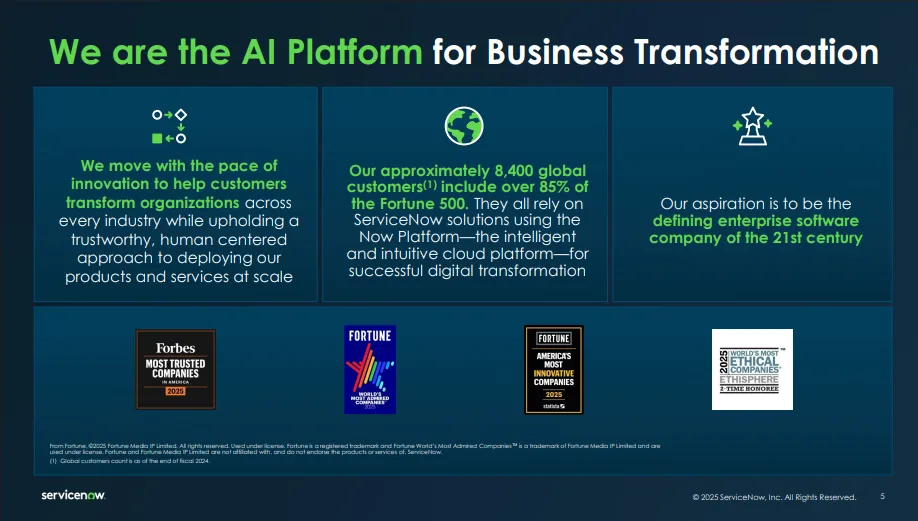 ServiceNow(NOW)是一家專注於 IT 管理工作流自動化的軟體公司,提供數位工作流和自動化解決方案的雲端平台。自從 2003 年成立以來,該公司成為企業軟體解決方案的領先供應商,為羅素 1000 指數和標準普爾 500 指數的成份股之一,並於 2018 年榮獲《富比士》全球最具創新力公司榜首。