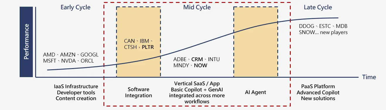 過去兩年各大企業於 AI 基礎建設投入達到鋒值,如今在 AI 投資敘事由過去 CSP 大廠於硬體端的軍備競賽轉向,由軟體端重新接棒,檢視過去兩年大量資本支出的投入是否回歸於實質上的生產力貢獻。