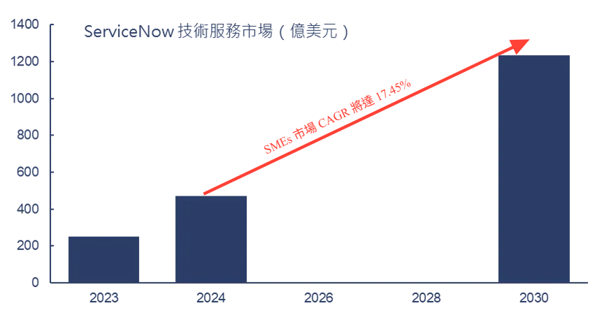 過去 ITSM 主要服務大型企業,但近年來中小企業(SMEs)數位化轉型加速,AI 自動化工具的導入成為市場新增長動能。研究機構預測 SMEs 市場 CAGR 將達 17.45%,顯示出該領域增長速度甚至超越整體 ITSM 產業,而這將成為 ServiceNow 最主要的動能來源。