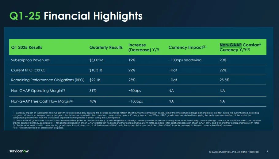 儘管全球局勢動盪,ServiceNow 卻在 1Q25 展現出全面出色的業績,所有營收和獲利指標都超出了預期上限,不管是在營收、RPO 及 cRPO 皆達成年增 20% 的增長幅度,其中訂閱增速雖放緩仍達到連續五季度年增 20% 的增速。