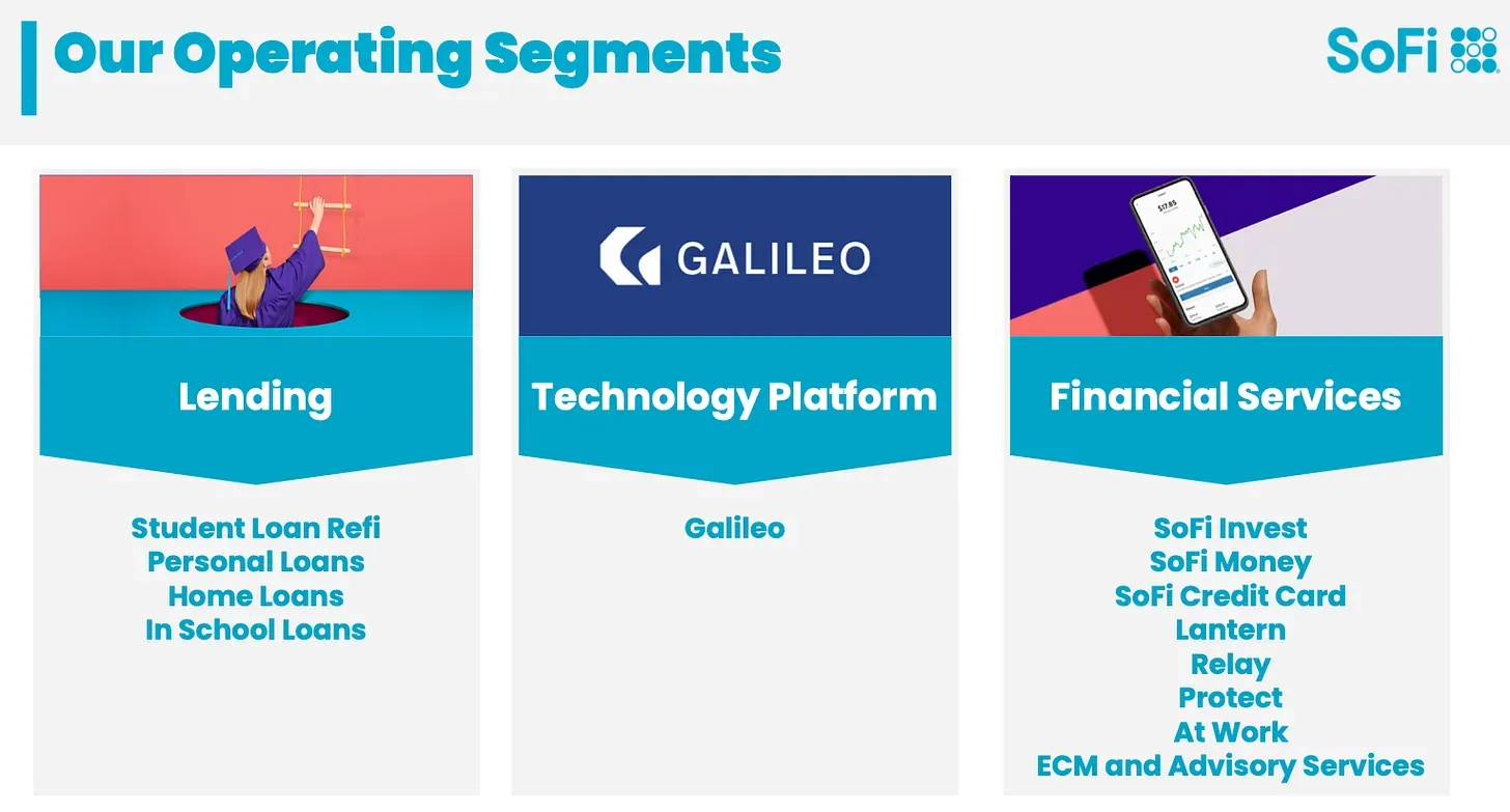 SoFi 精準地瞄準消費者對於傳統銀行無法滿足其金融需求的缺口,主打打破傳統銀行業服務的限制,提供一站式金融解決方案。進一步細分營收業務,可分為貸款部門 ( lending segment )、技術平台部門 ( technology platform segment ) 和金融服務部門 ( finance service segment ) 。