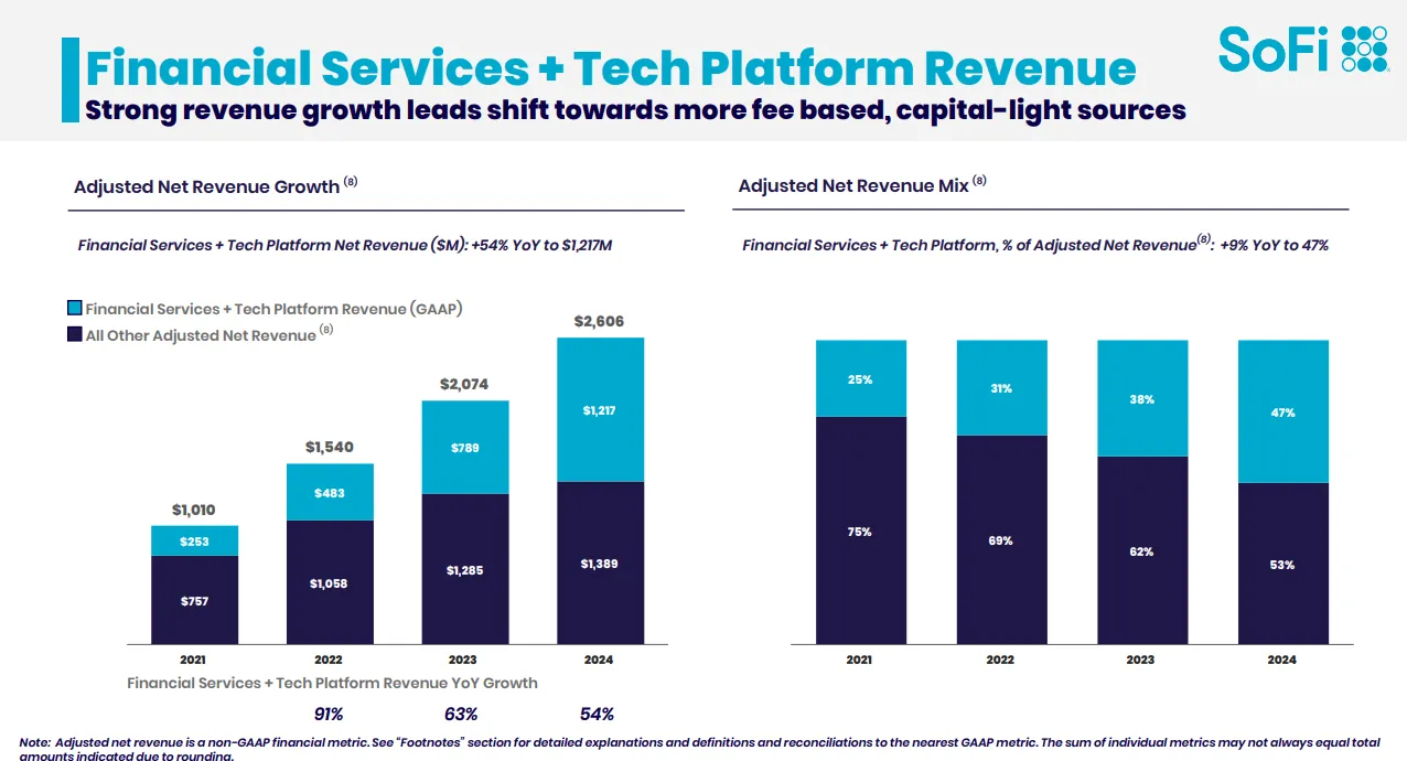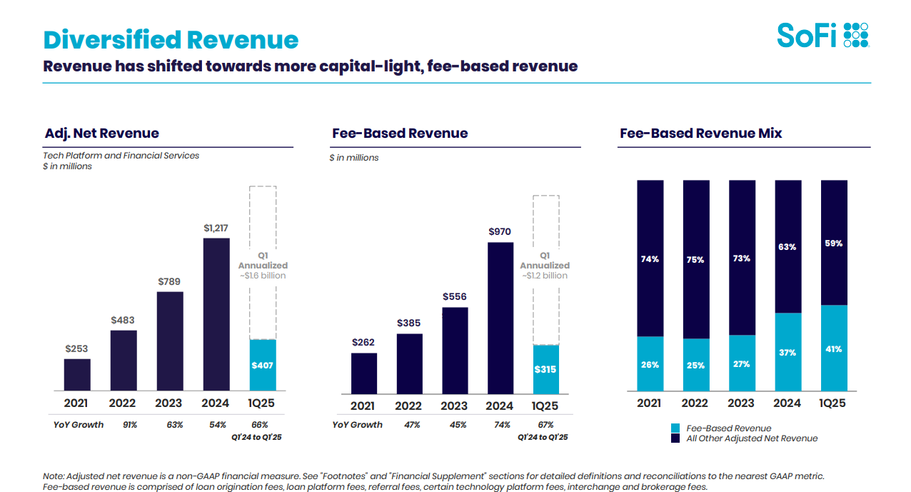 金融服務部門是 SoFi 增長最快的業務領域,雖然目前營收占比仍低於貸款部門,但近幾季成長迅速,未來有望成為公司的主要營收來源之一。