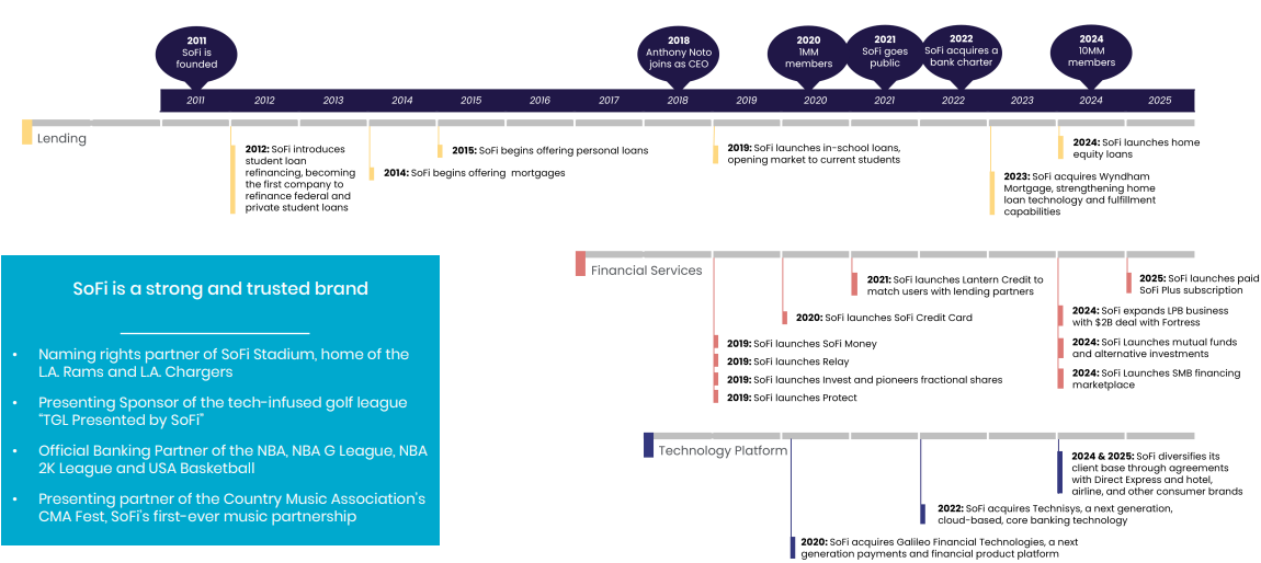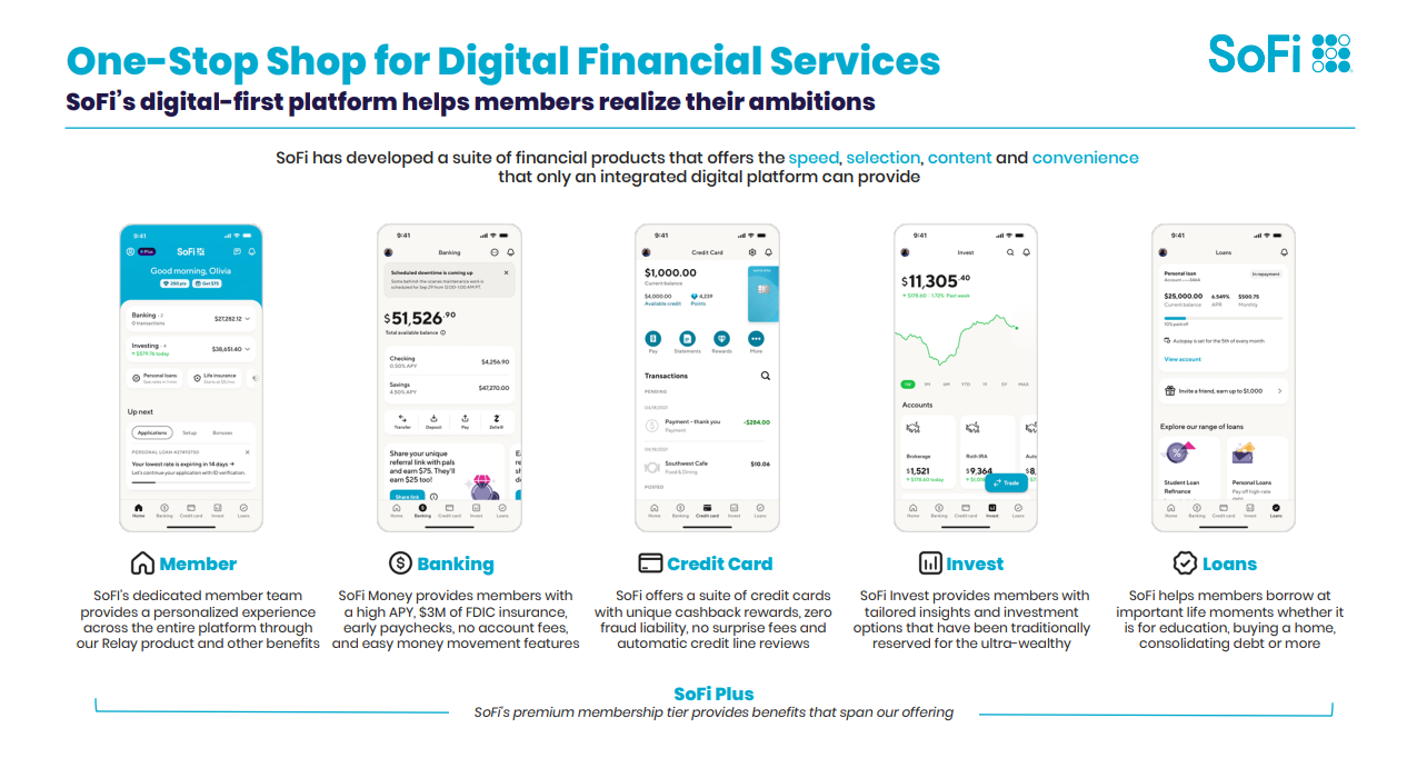SoFi 的核心商業模式在於其「一站式」數位金融平台,致力於提供完整的個人金融服務,包括存款、貸款、投資、保險與財務諮詢等。並透過無實體分行的經營模式降低成本以提供更具吸引力的服務。