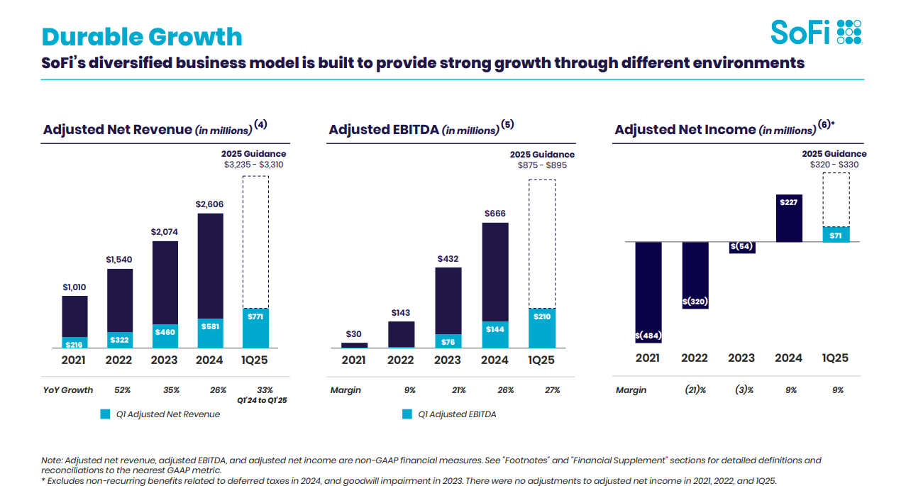 隨 1Q25 財報發布,SoFi 也持續透過會員及產品成長推動其業務增長,可以從下圖左圖中看到藍色 1Q25 營收持續以年增 33% 增長,而淨利則自 24 年翻正後預期今年能達到 32~33 億美元水準。