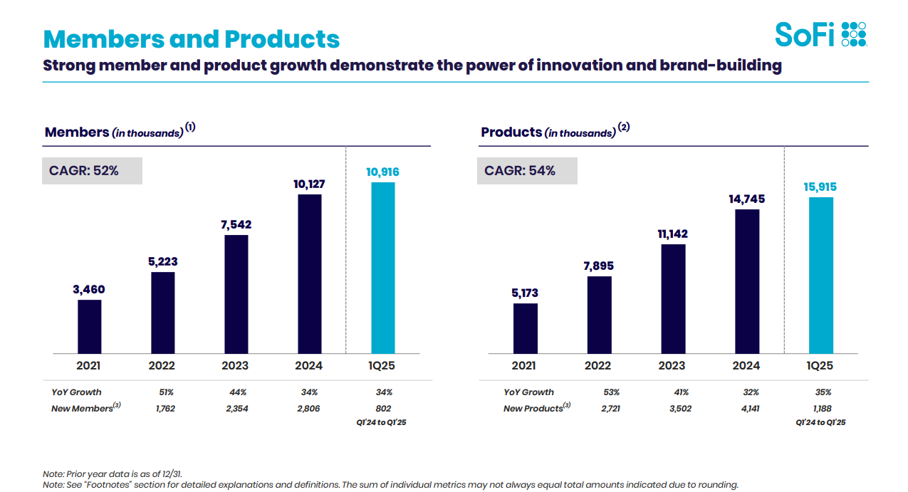 會員及產品做為 SoFi 業績的主要動力,在 2024 年取得了卓越的成績,至 2024 年底總成員數正式突破 1,010 萬人,1Q25 會員持續以年增 34% 速度持續增長,CAGR 來到 52%。顯示出 SoFi 在市場中的吸引力顯著提升。成員增長反映了公司在提供金融服務產品方面的多樣性及其特有的「金融服務生產力循環(FSPL)」策 略的成功。